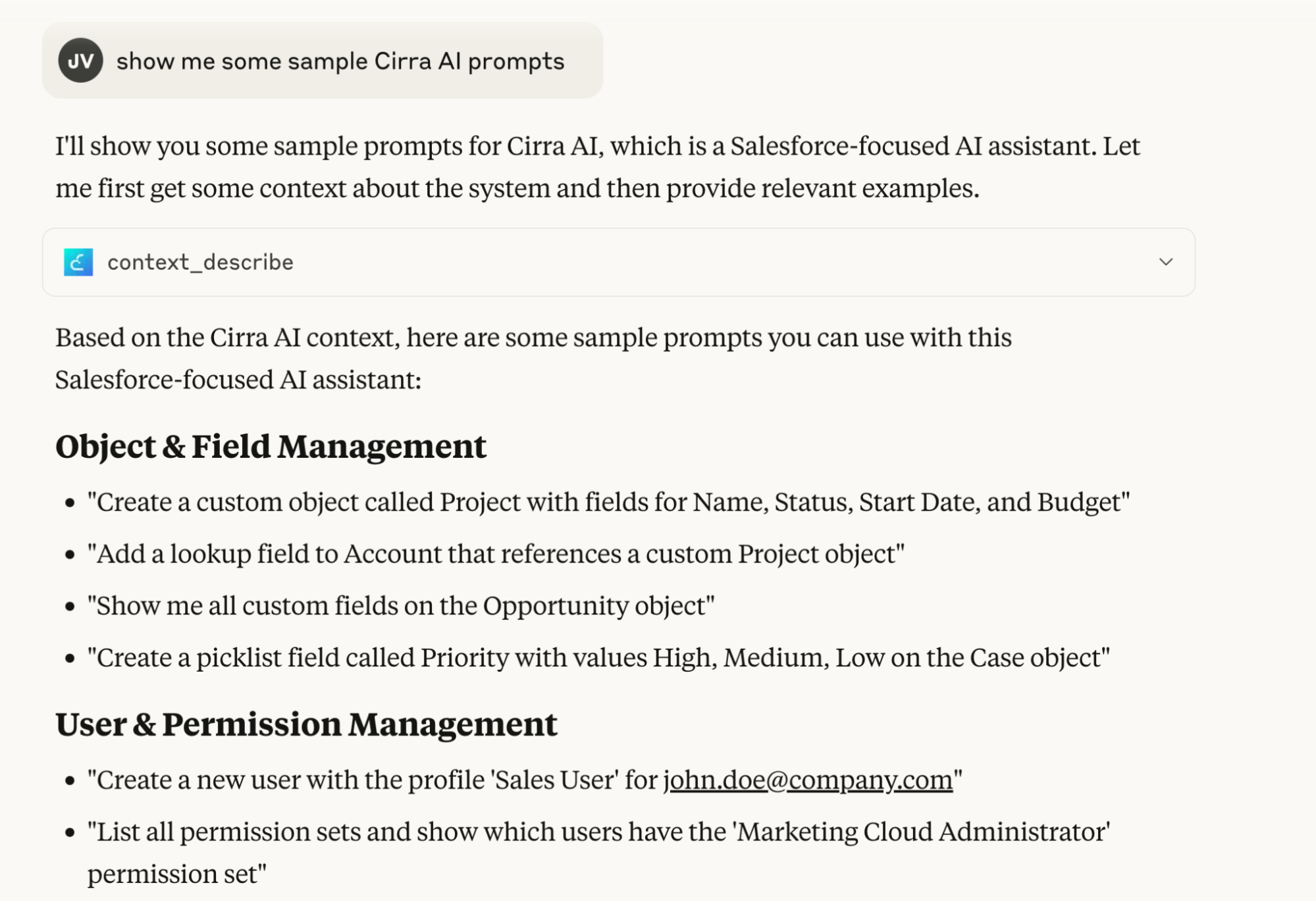 We recommend using one or more projects for your use of the Cirra AI MCP server. You can use these to upload specific instructions related to the Salesforce org(s) you are working with, as well as general guidance that helps the LLM perform well in your context. This allows you to write shorter prompts while still benefiting from detailed guidance.