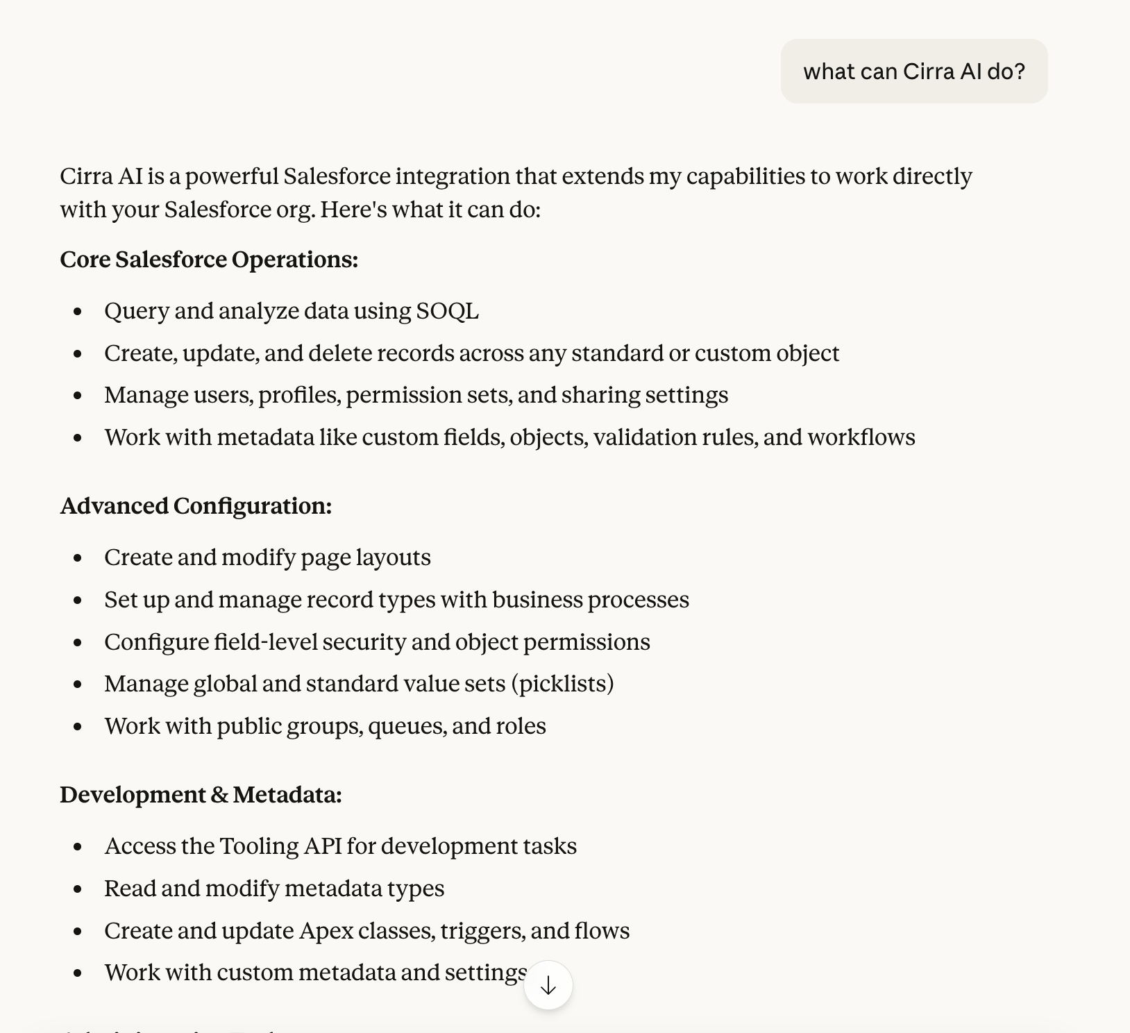 The MCP Server uses a default Salesforce connection for all operations. You can view and manage connected orgs and select a default team using the Cirra AI dashboard at https://app.cirra.ai/mcp (see Managing orgs)