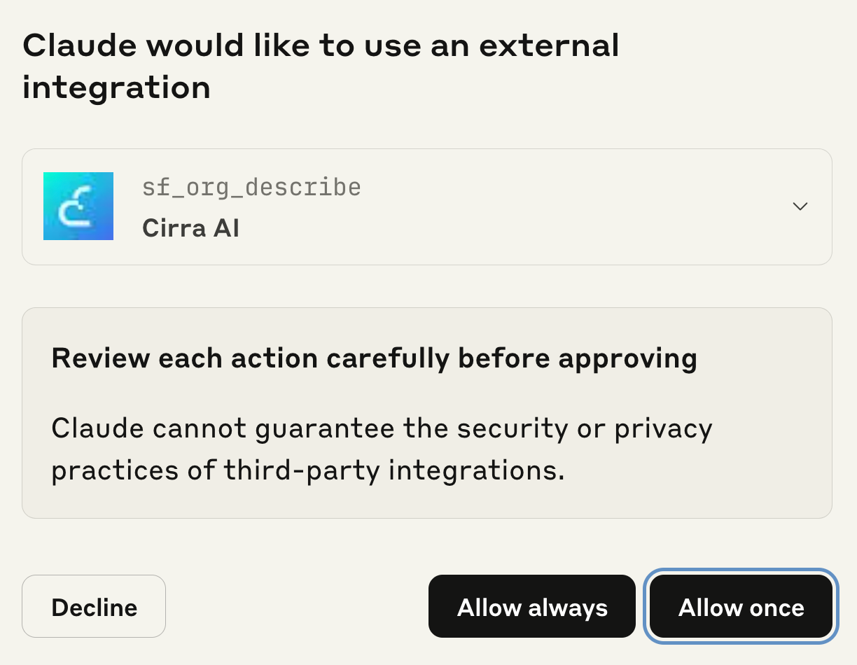 Note that the AI clients will ask your permission the first time before using any tool provided by the Cirra AI MCP server: