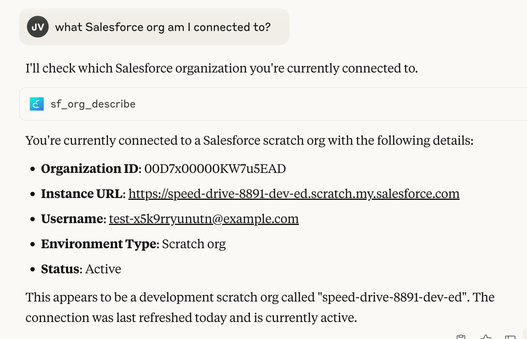 To confirm that the setup is correct, go to your AI client and ask: "What Salesforce org am I connected to?".